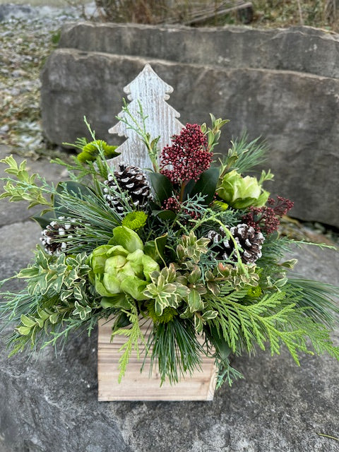 Winter Wood captures the essence of a forest retreat with its thoughtfully curated blend of natural elements. This rustic arrangement showcases lush evergreens and textured pinecones, accented with deep burgundy tones that add warmth and sophistication. Nestled in a white-washed pine vessel, the composition evokes the serene beauty of a winter woodland—perfect for holiday celebrations or creating an elegant seasonal focal point in any space.