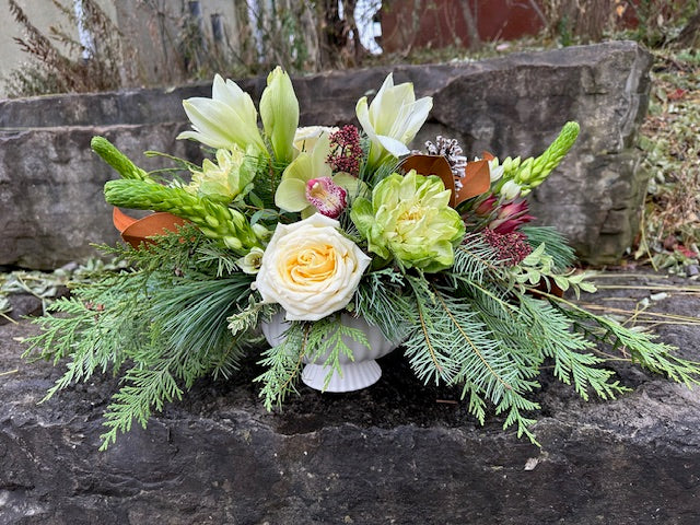 Elevate your holiday décor with this sophisticated centerpiece, thoughtfully composed with lush evergreens, pristine white amaryllis, orchids, magnolia leaves, and roses accented with natural cones. Arranged in an elegant pedestal compote, this arrangement brings refined elegance to any table or entryway. The timeless combination of seasonal botanicals and classic vessel makes it an exceptional gift for those who appreciate premium floral artistry and enduring holiday style.